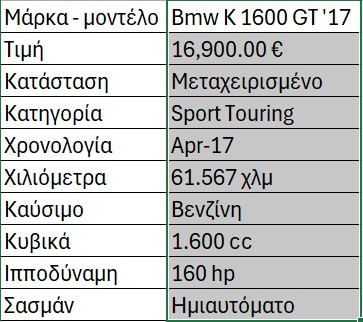 Πωλείται BMW K1600 GT 2017 από φίλο της λέσχης