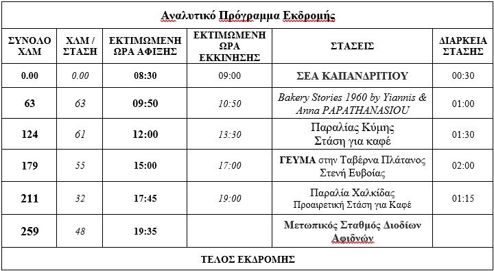 Το παραπάνω πρόγραμμα μπορεί να τροποποιηθεί από τον αρχηγό της εκδρομής εάν απαιτηθεί λόγω καιρικών συνθηκών ή κυκλοφοριακών συνθηκών, με έγκαιρη ενημέρωση των συμμετεχόντων.