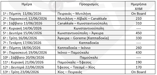 12η Ημέρα: Με κατεύθυνση το Cesme θα οδηγήσουμε στην νότια ακτή του κόλπου της Σμύρνης για να επιβιβαστούμε στο ferry που θα μας γυρίσει την Ελλάδα. Από το λιμάνι της Χίου θα πάρουμε το καράβι για Πειραιά, όπου θα έχουμε το χρόνο να ανταλλάξουμε εικόνες, συναισθήματα και εντυπώσεις από την επίσκεψή μας στην γειτονική χώρα με την οποία έχουμε περισσότερα κοινά από όσα νομίζουμε.