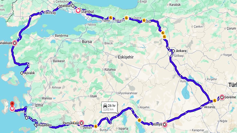 Μνημεία άλλων εποχών και πλήθος κατακτητών ανά τους αιώνες, έχουν αφήσει το αποτύπωμά τους σε όλη την έκτασή της, από τα παράλια του Αιγαίου έως τα απόκρημνα βουνά στο βορρά και τις αχανείς εκτάσεις της ανατολής. Από την κοντινή μας Μικρά Ασία με την αρχαία Έφεσο, μέχρι την Καππαδοκία και φυσικά την Κωνσταντινούπολη, μεγάλο κομμάτι της Ελληνικής ιστορίας βρίσκεται εκεί. Από τα παράλια της Ιωνίας, την Τροία, την Έφεσο μέχρι το Προκόπι, θα ακολουθήσουμε ένα τμήμα του πασίγνωστου «δρόμου του μεταξιού», θα πιούμε τσάι με μέντα, θα ψωνίσουμε μπαχάρια στις ξακουστές αγορές της χώρας, θα δοκιμάσουμε παραδοσιακά φαγητά και γλυκά και θα «γνωρίσουμε» τις παραδοσιακές τέχνες της χώρας.